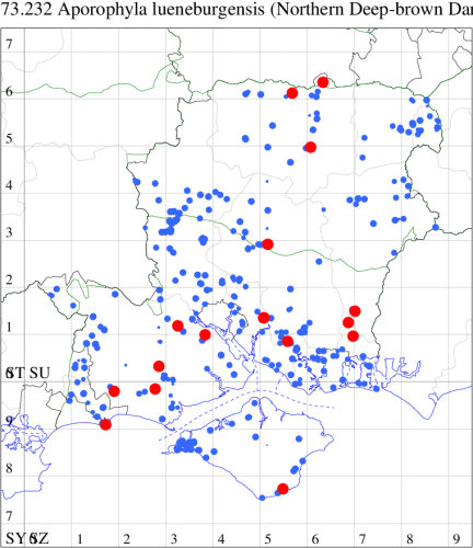 VC12: Testside Lakes, Leckford, one, 29 Aug; Leckford Estate, one, 02 Sep (GCE); Anna Valley, Andover, one, 01 Sep; one, 04 Oct; one, 05 Oct (TJN); North Waltham, one, 06 Sep (AJon); Ecchinswell, 11, 01 Sep (MJN); Great Haughurst Copse, Axmansford, two, 31 Aug (ACB); Upper Inhams Copse, Pamber Forest, one, 28 Aug (GJD); Alton, one, 01 Sep; one, 09 Sep (DBO); Windmill Hill, Chalton, one, 08 Sep (CJP); East Worldham, one, 30 Aug (RAng); present, , 30 Aug (EPil); Hammer Vale, Woolmer, one, 05 Sep (ASwa); Farnborough, one, 02 Sep (MThmp);