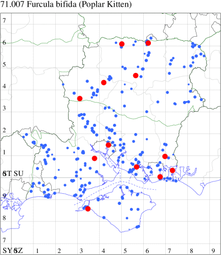 Common in woodland rides and clearings, hedgerows, parks, moorland, heathland and gardens throughout the British Isles. Widespread and common in Hampshire and on the Isle of Wight. Wingspan 35-42 mm. The main confusion species is Poplar Kitten F. bifida, but F. furcula is smaller and outer edge of central cross-band is usually rather irregular and usually only finely outlined in black in the leading half, while in F. bifida the outer margin of the median fascia is black and more evenly curved (MBGBI Vol 9). Larva feeds on Grey, Goat and White Willow, White and Black Poplar, and Aspen, over-wintering as a pupa.