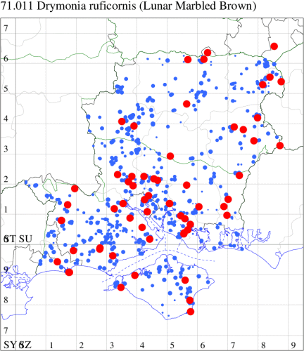 Common in oak woodland throughout much of England and Wales, and parts of Scotland. In Hampshire and on the Isle of Wight still locally common in the New Forest and the north-east, but has declined markedly from the middle of the 20th Century. Wingspan 39-44 mm. The main confusion species is Lunar Marbled Brown D. ruficornis, which see. Larva feeds on Oak, over-wintering as a pupa.
