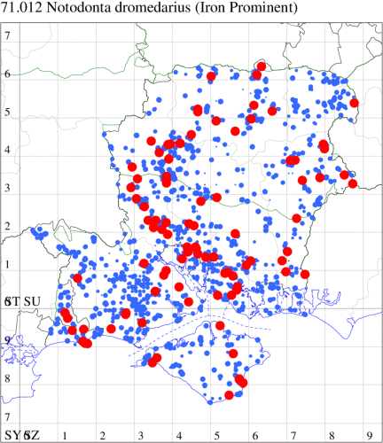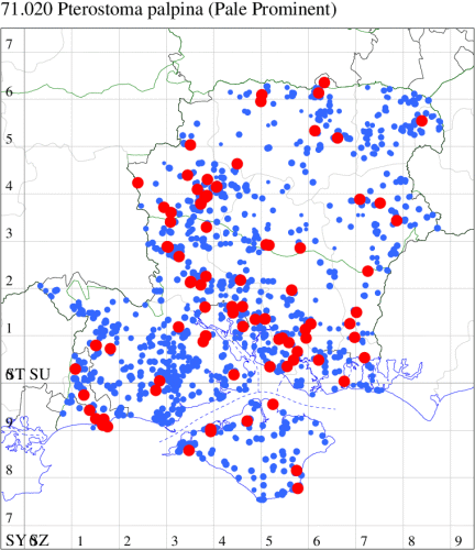 Common in woodland, scrub, parks and gardens throughout the British Isles. In Hampshire and on the Isle of Wight locally common, mainly in the south west. Wingspan 40-50 mm. The main confusion species is Maple Prominent P. cucullina, which is smaller, paler and has a white subterminal line and white subterminal fascia (MBGBI Vol 9). Larva feeds on various broad-leaved trees, including Birch, Hazel, Alder, Aspen, Sallow, Hawthorn, Lime, Oak, Beech and Rowan, over-wintering as a pupa.