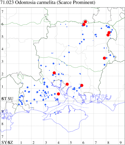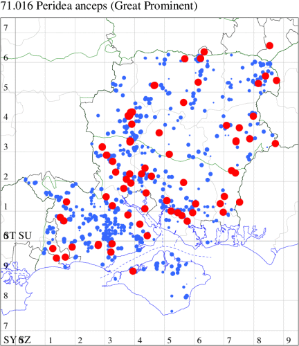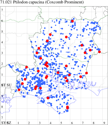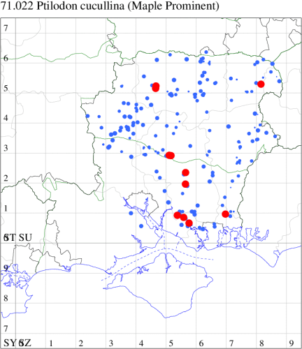 Local in broad-leaved woodland, scrub, hedgerows and gardens throughout much of south-eastern England. A moth with a curious distribution in our area, completely absent from the New Forest and the Isle of Wight but thinly distributed from the south-east of Hampshire up to the north and north-east. Wingspan 37-46 mm. The most likely confusion species is Coxcomb Prominent P. capucina, which see for differences. Larva feeds on Field Maple, mainly on young trees, over-wintering as a pupa.