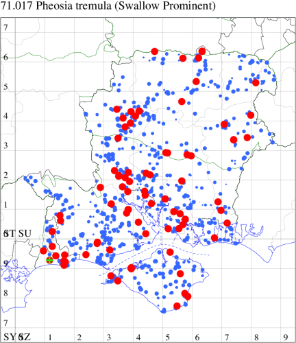 Common in woodland, plantations, scrub, gardens and parks throughout the British Isles. Widespread and common in Hampshire and on the Isle of Wight. Wingspan 50-64 mm. The main confusion species is Lesser Swallow Prominent P. gnoma, in which the thin white tornal line of Swallow Prominent is replaced by a very distinct white, wedge-shaped dash. Larva feeds on Aspen, Poplar, Willow and Sallow, over-wintering as a pupa.