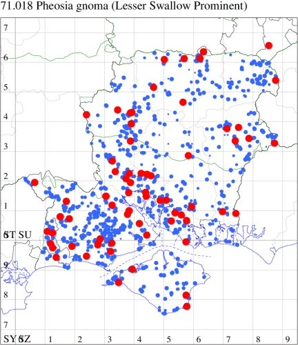 Common in woodland, heathland, moorland, downland, parks and gardens throughout the British Isles. Widespread and common in Hampshire and on the Isle of Wight. Wingspan 46-58 mm. The main confusion species is Swallow Prominent P. tremula, in which the very distinct white, wedge-shaped tornal dash of Lesser Swallow Prominent is replaced by a thin white line. Larva feeds on Silver and Downy Birch, over-wintering as a pupa.