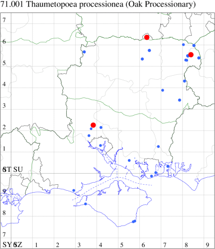 Rare immigrant from mainland Europe, appearing in southern England. It is expanding its range on the continent and is resident on the Channel Islands, and likely to be reported with increased frequency. While the Moths of Hampshire and Isle of Wight (Goater & Norriss, 2001) states "15 or so records of this species (all males), since the first in 1983" this account must be erroneous as the relevant atlas map shows no dots for the county and there are no reports on the county database from mainland Hampshire before two on consecutive days in mid-2004. On the Isle of Wight, reported for the first time in September 1998. The year 2020 saw a considerable increase in numbers and expansion of range, particularly into the north-east of Hampshire and Isle of Wight, with at least 26 individuals being reported. Wingspan male 31-35 mm, female 36-41 mm. Similar to Pine Processionary T. pityocampa, but has smaller and weaker comma-shaped marking in the centre of the forewing. Larva feeds on Sessile Oak, Pedunculate Oak, Turkey Oak and Evergreen Oak, living gregariously within a silken web.