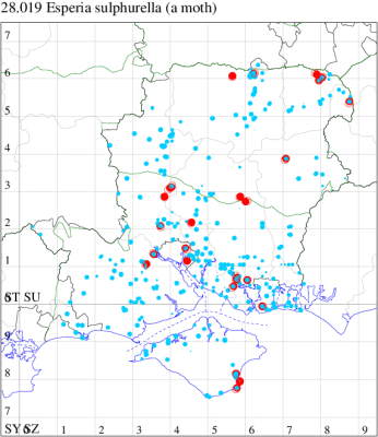 VC11: Pig Bush, NF*, one, 17 Jul (CL); Woodlands, New Forest, present, 10 Aug (RBW); Totton, one, 27 May; two, 12 Jun; one, 11 Aug (LH); East Tytherley, one, to actinic, 10 Aug (GCE); Romsey, one, 16 Jul; one, 06 Aug; one, 16 Aug (MB); Dibden Purlieu*, one, to actinic, 17 Aug (RAC); Southampton*, one, to actinic, 01 Jul (MGP det. MJW); Eastleigh*, one, to actinic, 02 Jul; one, to actinic, 07 Aug; one, to actinic, 26 Aug; one, to actinic, 08 Sep (KArb); Allbrook*, one, to actinic, 12 Aug; one, to actinic, 14 Aug (SI); Fareham, one, to actinic, 09 Aug; one, to actinic, 23 Aug (MLO); one, 04 Jun; one, field observation, 06 Jun; one, 08 Jun; one, 09 Jun; one, 11 Jun; one, field observation, 13 Jun; one, field observation, 14 Jun; three, 25 Jun; one, 26 Jun; one, 11 Aug; one, 14 Aug (KJW); one, in flight, flying by day close to ground level at base of pellitory-of-the-wall, 04 Jul (RJD); Wickham, three, 08 Aug (JRDS); West Walk*, three, 14 Aug (F.M.G.); Southsea, one, 02 Jun; one, 08 Jun; one, 29 Jun; one, 28 Jul (JGe);