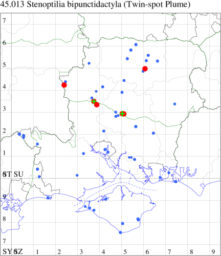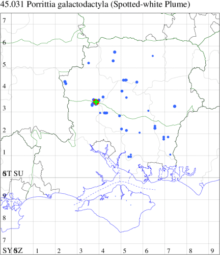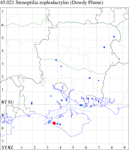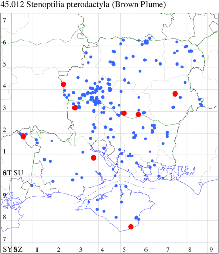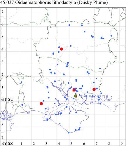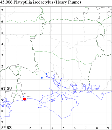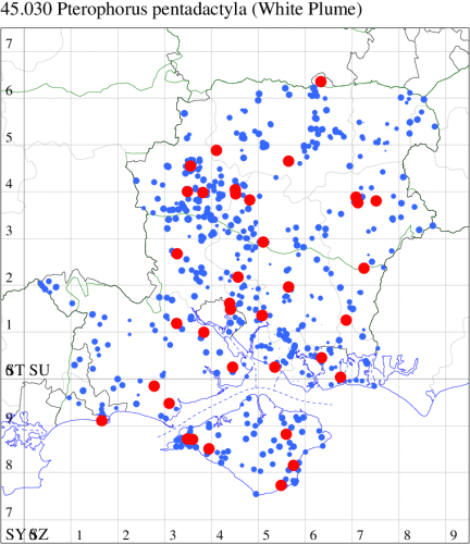 Nationally scarce (Nb) on chalk downland and waste ground, mainly in the southern counties of England. In Hampshire restricted to the few areas of unimproved grassland at sites such as Oxenbourne, Stockbridge and Magdalen Hill Down. Recently recorded on the Isle of Wight for the first time since 1981. Wingspan 20-27 mm. Very similar to several other species of plume moth, from which separable only by dissection of the genitalia. Larva feeds on stems of Wild Marjoram.