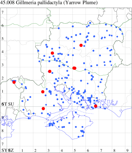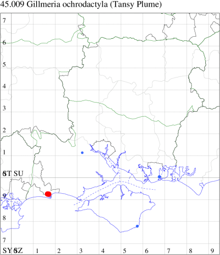 Nationally scarce (Nb) in flower meadows and gardens in parts of England and Wales. In Hampshire the foodplant is very local and so, therefore is the moth, which is known only from the Portsmouth area, where it is common amongst the foodplant. Not recorded from the Isle of Wight to date. Wingspan 24-28 mm. Similar to G. pallidactyla but the third pair of legs in the latter is largely one colour, in the present species it is banded brown and white below the middle spur, and the forewing is more distinctly marked. Gillmeria ochrodactyla flies around tansy (Tanacetum vulgare), and therefore also on ruderal grasslands. G. pallidactyla lives on yarrow (Achillea).