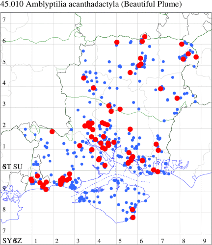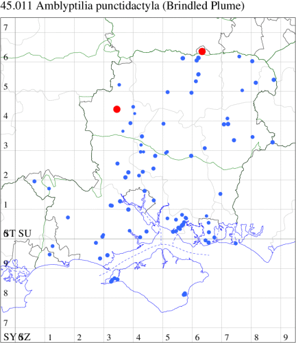 Local in woodland, heaths and river-banks throughout much of the British Isles. In Hampshire and on the Isle of Wight widespread, but generally less common than A. acanthadactyla. Wingspan 18-23 mm. Confusable with A. acanthadactyla. A. punctidactyla has a greyish or, when fresh, dark greenish tinge, whereas A. acanthadactyla is reddish; also, A. punctidactyla has a lot of speckling on the basal half of the forewings, A. acanthadactyla has very little. Larva feeds on flowers and seeds of Hedge Woundwort, Common Restharrow, Spiny Restharrow and Meadow Crane's-bill.