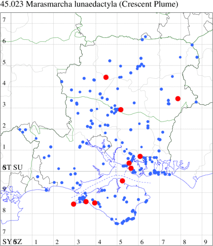 For the maps, all records prior to 2024 are shown by a blue dot (the larger the dot, the more recent), with the current year's records shown in red. As previous records are superimposed on any report for 2024, new sites have greater emphasis (i.e. will show as 'more red').