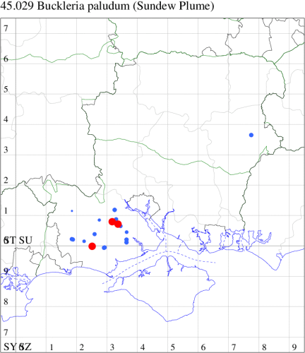Nationally scarce (Na) on damp heathland and mosses in parts of England and Wales, more numerous in the south. In Hampshire widespread in the bogs of the New Forest in the vicinity of the foodplant: elsewhere, two adults reported from Shortheath Common, Oakhanger in August 2023 were the first sightings for North Hampshire since Fassnidge reported it from Woolmer Forest in 1928. Not recorded from the Isle of Wight to date. Wingspan 11-13 mm. The moth is easily disturbed in daytime, and flies naturally just before dusk. Larva feeds on leaves of Round-leaved Sundew.
