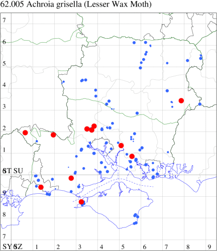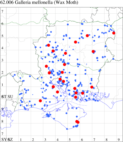 Common around beehives throughout England and Ireland. Widespread in Hampshire and on the Isle of Wight. Wingspan 30-41 mm. Larva constructs, and feeds within, galleries in honeycombs.
