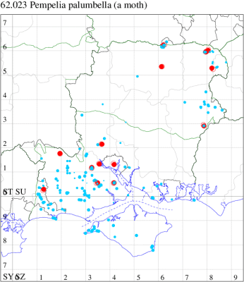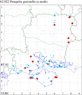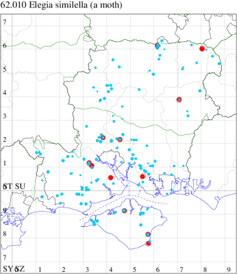 VC11: Shatterford, NF*, one, 14 Jul; present, 14 Jul (RBW, MWa); Woodlands, New Forest*, present, 17 Jun (RBW); Dibden Purlieu, one, to actinic, 23 Jun; one, to actinic, 24 Jun; two, to actinic, 25 Jun; one, to actinic, 26 Jul; two, to actinic, 31 Jul; one, to actinic, 14 Aug; one, to actinic, 15 Aug (RAC); Titchfield Haven NNR, one, 12 Jul (KC det. RJD); Catisfield, one, 23 Jun; one, to actinic, 25 Jun (ALR); Portsmouth, three, 26 Jun; one, 15 Jul (IRT); Sway, one, to actinic, 22 Jul (S&SL); Pennington, one, 10 Aug (RFC);