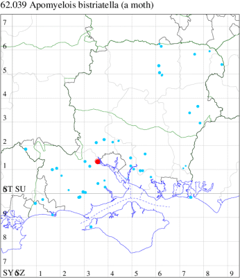 Common in rough ground and meadows throughout England and Ireland. Widespread and fairly common in Hampshire and on the Isle of Wight. Wingspan 22-27 mm. This easiest of the Phycitodes to identify, more robust than its congeners and more strongly marked, with the three dots well-developed and characteristically placed [Goater]. Larva feeds within flowerheads of Thistle, Tansy and Mugwort.