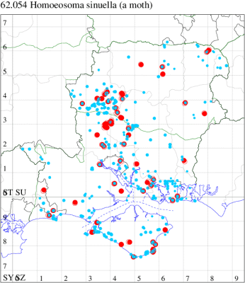 For the maps, all records prior to 2020 are shown by a blue dot (the larger the dot, the more recent), with the current year's records shown in red. As previous records are superimposed on any report for 2020, new sites have greater emphasis (i.e. will show as 'more red').