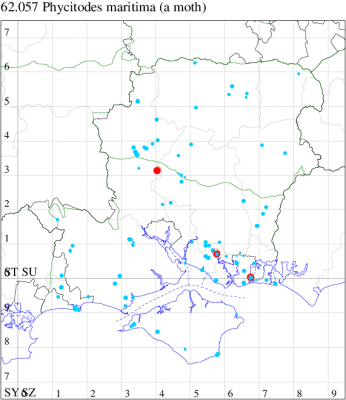 Nationally scarce (Na) on sandy beaches by the sea from Sussex to Dorset. In Hampshire and on the Isle of Wight the foodplant is local and uncommon and the moth has occurred only sporadically along the Solent coast of both counties, in the Christchurch area, Pennington, Freshwater, St Helens and Hayling. Wingspan 22-25 mm. This species bears some resemblance to a Homoeosoma or Phycitodes, but may be distinguished at once by the long, porrected labial palpi which in the other genera are shorter and ascending [Goater]. Larva feeds within stems of Prickly Saltwort, over-wintering as a pupa.