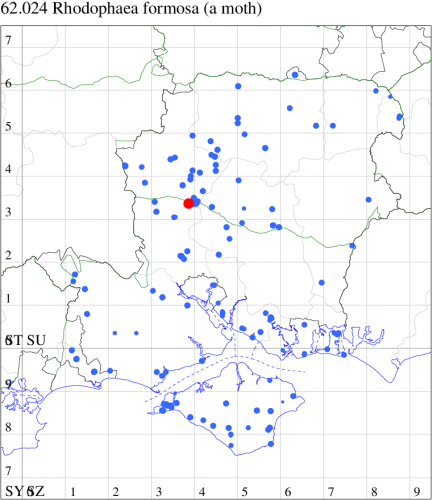 VC11: Ogden's Purlieu, NF, present, several, 11 Jul; Howen Bottom, NF, present, several, 22 Jul (AMD); Pig Bush, NF, one, 24 Jul (NRJ); Beaulieu Road, NF, one, at dusk, 18 Jul (AMD); Marchwood, one, 01 Jul (TDCh); one, 25 Jun (CTha); Dibden Purlieu, one, 25 May; Dibden Purlieu, NF, one, 12 Jul (RAC); Merritown Heath, one, 29 Jun (DFoo); Christchurch: Cross Way, one, 26 Jun (LPyk); Hengistbury Head NNR, two, 09 Aug (BKin det. MJef); Hengistbury Head, three, 26 Jun; two, 26 Jun; one, 26 Jun; five, 26 Jun (MJef); Sway, one, 25 Jun (SKee);