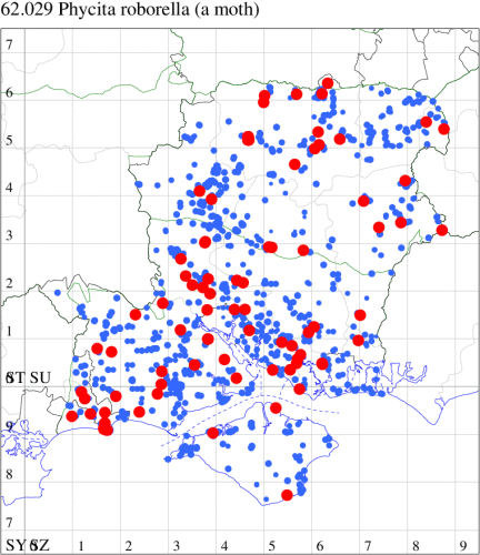 VC11: Brockenhurst, one, 04 Aug (MWelf); Marchwood, one, 31 Jul; one, 05 Aug; one, 18 Jun (CTha); Woodlands, NF, one, 26 May (RBW); Romsey, one, 14 May (NRJ); North Baddesley, one, 11 Aug (IWel); Swaythling, Southampton, one, 03 Jun (MEdg); Allbrook, one, 10 May (SIng); Stubbington, one, 25 Jun (DPH); Funtley, one, 30 Jul (TDC); Lee-on-Solent, one, 31 Aug (IHrg); Fareham, one, 07 May (ADT); Botley, one, 23 Jul (SLB); Portchester, one, 11 Aug (DH-J); Waterlooville, one, 12 May; three, 14 May; one, 17 May; one, 09 Jun; six, 11 Aug (DWhe); Merritown Heath, present, 17 Aug (DFoo); Hurn, one, 31 Jul (MJef); Christchurch: Cross Way, one, 14 May; one, 31 Jul; one, 04 Aug; one, 05 Aug (LPyk); Hengistbury Head, one, 30 Jul; three, 10 May; two, 27 Aug; one, 03 Jun; three, 10 May (MJef); Hengistbury Head NNR, larva, one, field obs., quercus, 27 Oct (JOug); Sway, one, 15 May (SKee); Pilley, NF, one, 11 May (MHay);
