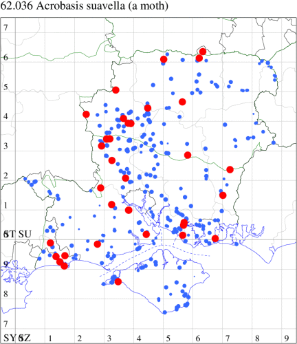 For the maps, all records prior to 2024 are shown by a blue dot (the larger the dot, the more recent), with the current year's records shown in red. As previous records are superimposed on any report for 2024, new sites have greater emphasis (i.e. will show as 'more red').