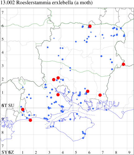 VC11: Marchwood, one, 07 Aug (CTha); Romsey, one, 30 Jul; present, field obs., , 31 Jul; two, 31 Jul; present, field obs., , 01 Aug; one, 01 Aug (SRC); one, 31 Jul (NRJ); North Baddesley, one, 11 Aug (IWel); Waterlooville, one, 23 Jun; one, 11 Aug; one, 13 Aug; two, 26 Aug (DWhe); West Walk, one, 23 Aug (F.M.G.); Merritown Heath, present, 17 Aug (DFoo); Hengistbury Head, one, 10 May (MJef);
