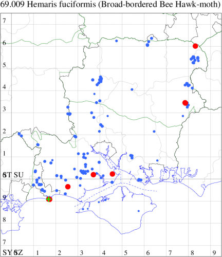 Nationally scarce (Nb) along woodland margins and on heathland in England and Wales. In Hampshire and on the Isle of Wight, has recovered from a low level in the 1970s; the species is reported occasionally, with the main population occurring in the New Forest. Wingspan 46-52 mm. The most likely confusion species is Narrow-bordered Bee Hawk H. tityus, which see for differences. Larva feeds on Honeysuckle, over-wintering as a pupa.