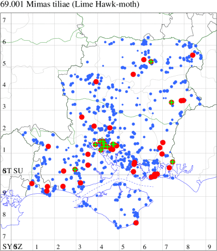 Common in broad-leaved woodland, parks and gardens throughout much of southern England, north to Yorkshire. In Hampshire and on the Isle of Wight fairly common, especially in suburban areas, where the moth is sometimes seen newly emerged on lime trunks, and where the pupa can sometimes be dug from under lime and elm trees. Wingspan 70-80 mm. Unmistakable. Larva feeds on Lime, English Elm, Birch and Alder, over-wintering as a pupa.
