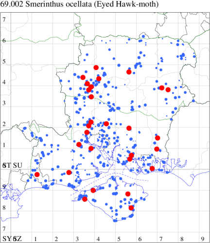 Common in gardens, orchards, parks, fens, scrub and woodland throughout England and Wales. Widespread and fairly common in Hampshire and on the Isle of Wight. Wingspan 75-95 mm. Larva feeds on most species of Salix and Malus, over-wintering as a pupa.