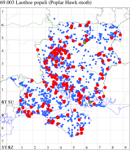 Common in parkland, gardens, fens, woodland, heathland and moorland throughout the British Isles. Widespread and common in Hampshire and on the Isle of Wight. Wingspan 72-92 mm. Unmistakable. Larva feeds on Aspen, White Poplar, Black Poplar, Goat Willow and Grey Willow, over-wintering as a pupa.
