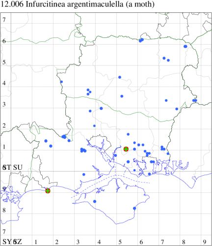 Local in damp shady places throughout much of England, more numerous in the south. In Hampshire and on the Isle of Wight local but probably overlooked, especially on the Island. Wingspan 8-9 mm. Similar to Eudarcia richardsoni, which see. The larva feeds in a silken tube amongst lichens growing on shaded walls and rocks, sometimes on tree-trunks.