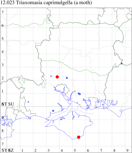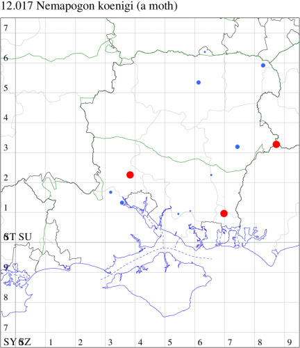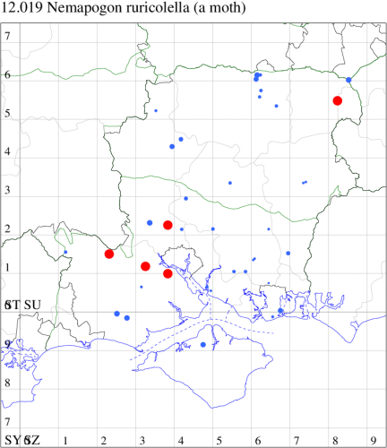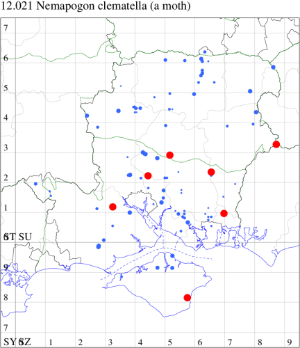 For the maps, all records prior to 2024 are shown by a blue dot (the larger the dot, the more recent), with the current year's records shown in red. As previous records are superimposed on any report for 2024, new sites have greater emphasis (i.e. will show as 'more red').