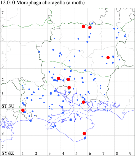 For the maps, all records prior to 2024 are shown by a blue dot (the larger the dot, the more recent), with the current year's records shown in red. As previous records are superimposed on any report for 2024, new sites have greater emphasis (i.e. will show as 'more red').