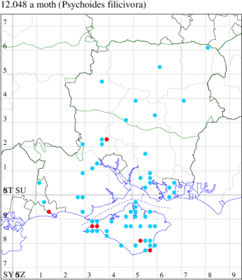 VC10: Freshwater, one, field observation, 05 May; one, 28 May; two, field observation, 17 Jun; one, 23 Aug; one, 12 Sep; one, 05 Nov; one, 09 Nov; one, 18 Nov; one, 15 Dec (DCoo); Afton Marsh, 20, to pheromone lure, tIP Lure, 07 Jun (SDav); Bonchurch, larva, one, field observation, larva under sori cluster on underside of a Fern leaf: larva with pale brownish head, 11 Jul (PBar); Gat Cliff, Appledurcombe, larva, present, field observation, larvae on Hart's-tongue fern, 10 Nov (IOut);