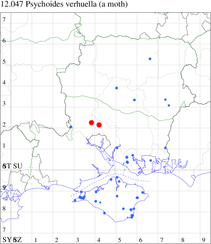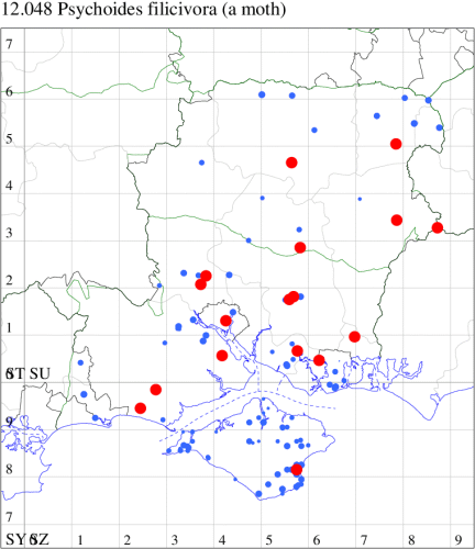 Local in damp, shady woodland throughout much of England and Wales, more numerous in the west. Widespread and sometimes locally common on the Isle of Wight, but rarely recorded on mainland Hampshire. Wingspan 9-12 mm. Day-flying. More frequently recorded in the larval stage, when the mines and cases are occasionally numerous; the imago resembles P. filicivora with violet tinge but lacks white tornal spot. Larva mines fronds of Hart's-tongue, subsequently living within a movable case.