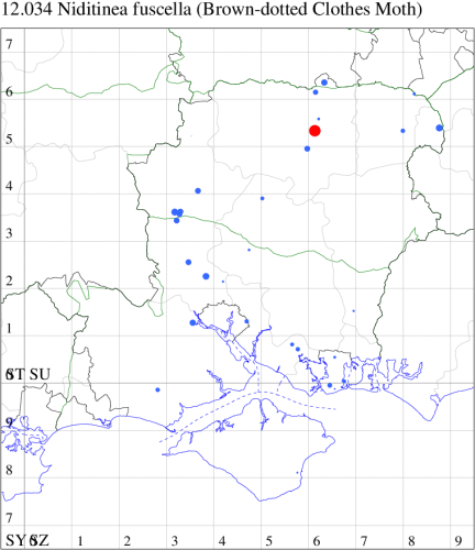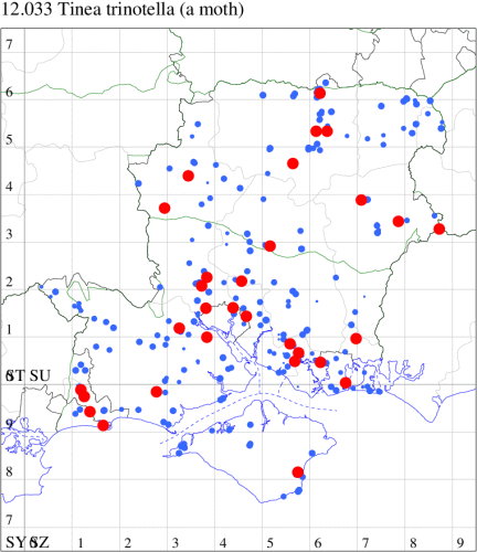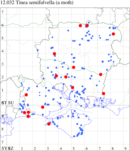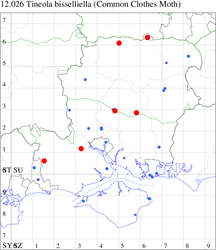 Local in houses and farm buildings throughout the British Isles. In Hampshire and on the Isle of Wight formerly the most abundant clothes moth, but now outnumbered by Case-bearing Clothes Moth Tinea pellionella. Wingspan 9-16 mm. Characterised by reddish ochreous head and pale buff, unmarked forewings. Larva feeds on woollen materials, animal fur, feathers in bird nests and insect collections, living within a silken tube or tent, causing sufficient damage to be a serious pest in some areas.