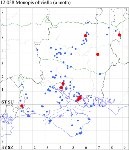 VC12: Cole Henley, one, 10 Aug (GCE); Magdalen Hill Down NR, one, gen. det, 19 Jul (AMD); Morn Hill, Winchester, three, 09 May (CRB, DAS); one, 17 Aug (CRB, PDF, DAS, LHur); Cheriton, one, 11 Aug (DAS); North Waltham, one, 17 May; one, 05 Aug (AJon); Inhams Copse, Pamber, one, 05 Aug; one, 12 Aug (GJD); Chawton, one, 06 Jun (DAS);