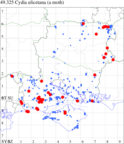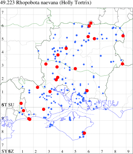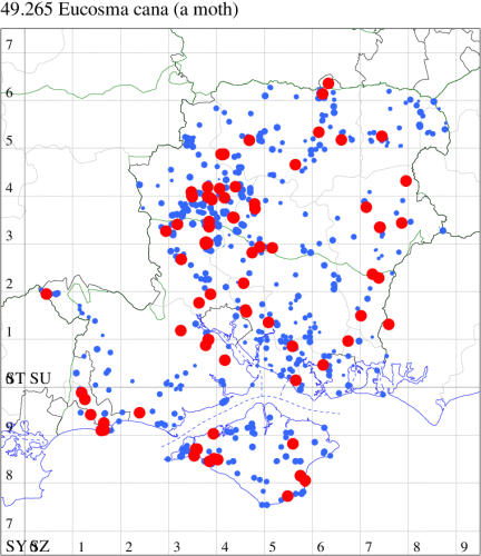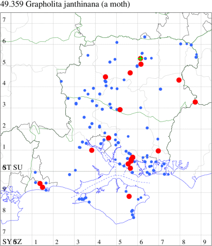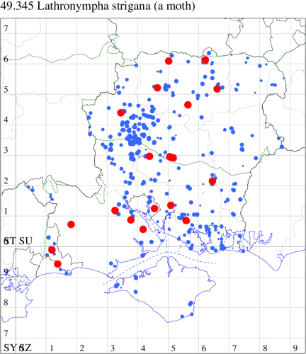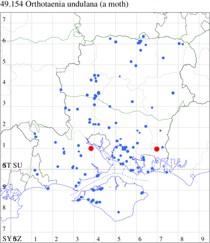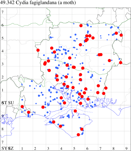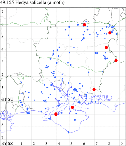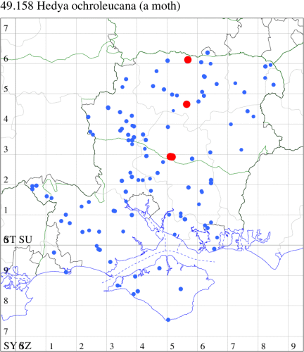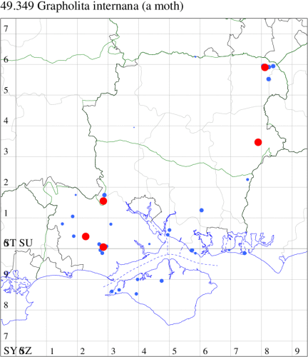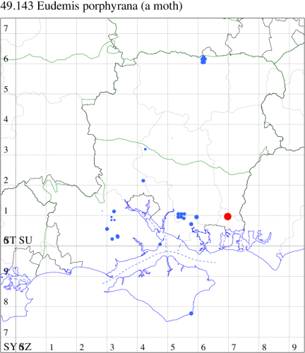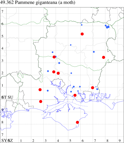VC11: Linford Bottom, two, 05 Aug (CLew); Frogham, one, 16 Jul (NTO); Romsey, one, 02 Aug (NRJ); Dibden Purlieu, NF, one, 27 Aug (RAC); Allbrook, one, 28 Jul; one, 10 Aug; one, 11 Aug (SIng); Botley Wood, one, 05 Aug (AMD); Dean, Bishop's Waltham, present, 22 Jul; present, 30 Jul (CMor); Waterlooville, one, 04 Jul; one, 01 Aug; one, 07 Aug; three, 13 Aug; one, 15 Aug; two, 17 Aug; two, 24 Aug; three, 26 Aug; three, 27 Aug; three, 29 Aug (DWhe); West Walk, seven, 23 Aug (F.M.G.); Southleigh Forest, three, 22 Aug; five, 04 Jul (CGree det. HMun); Merritown Heath, one, 29 Jun; present, 17 Aug (DFoo);