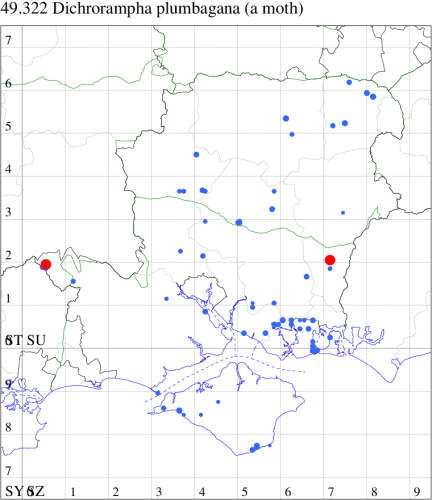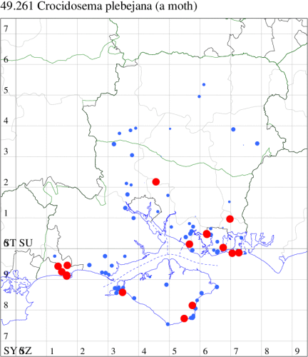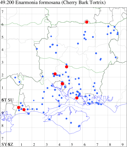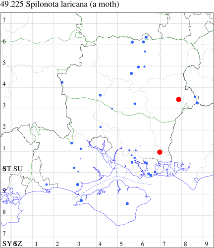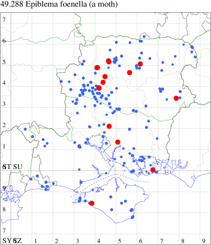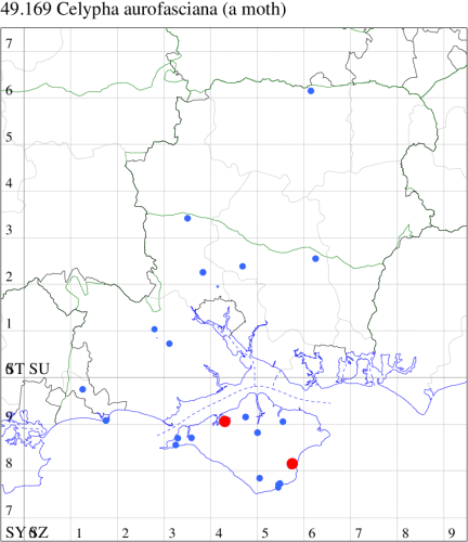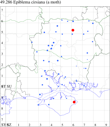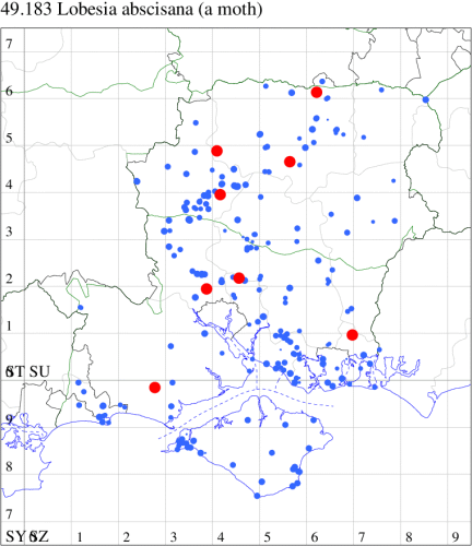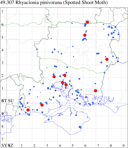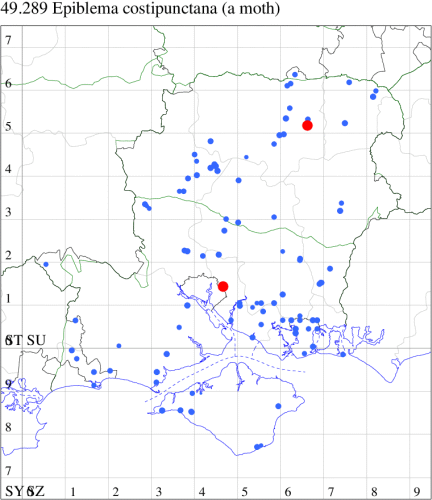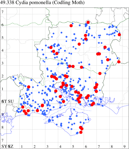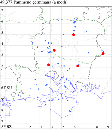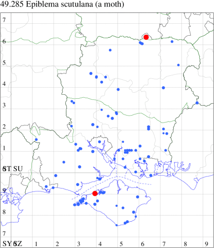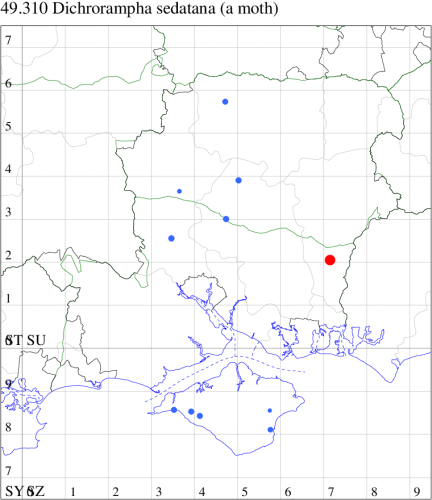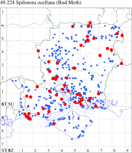 VC11: Marchwood, one, 31 Jul (CTha); Itchen Valley C.P., two, 19 Jul (F.M.G.); Stubbington, one, 29 Jun; one, 19 Jul (DPH); Lee-on-Solent, one, to pheromone lure, jAN Lure, 02 Jul (IHrg); Fareham, one, 20 Jul (ADT det. RJD); one, 30 Jul (IMcP); two, 25 Jun; one, 23 Jul (MLO det. RJD); Waterlooville, one, 30 Jul (DWhe); Christchurch: Cross Way, one, 26 Jun; one, 10 Jul (LPyk det. MJef); Tuckton, Bournemouth, one, 03 Jun (APard);