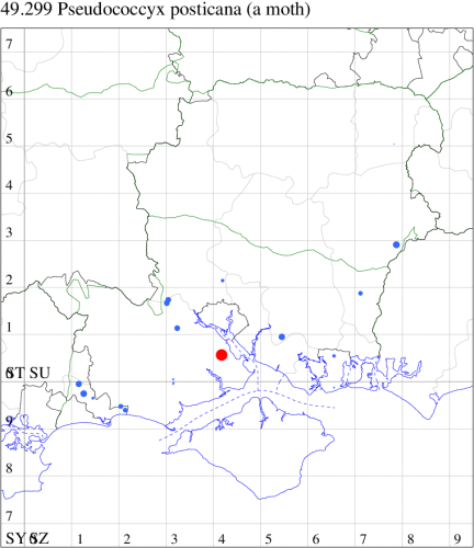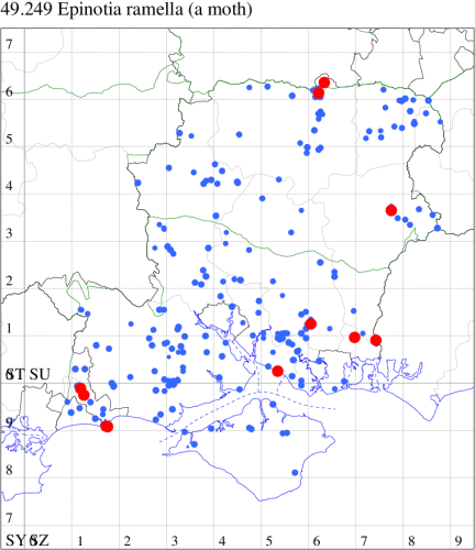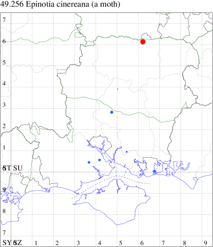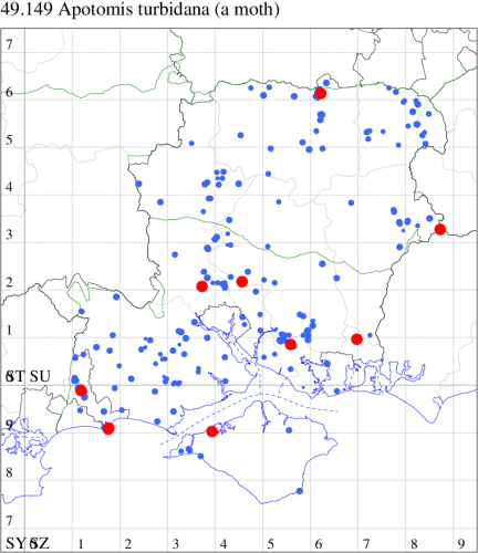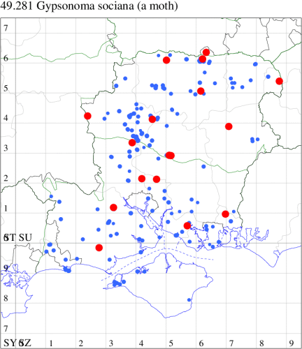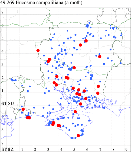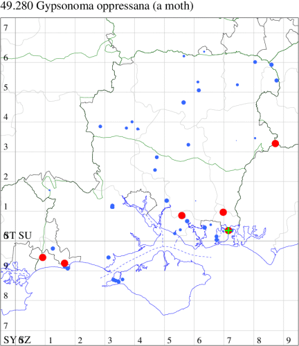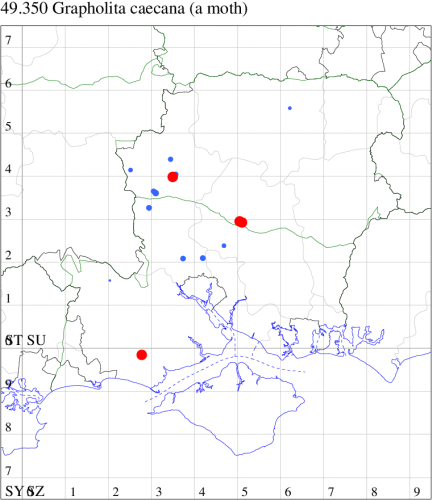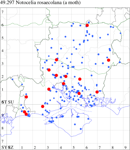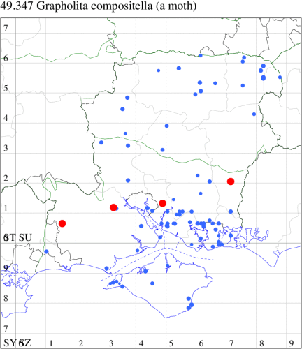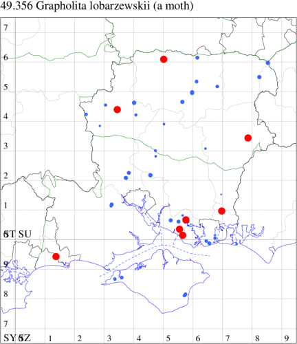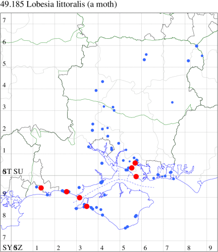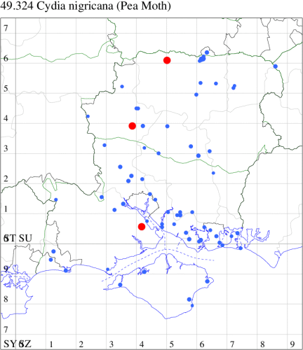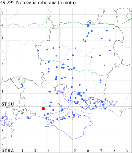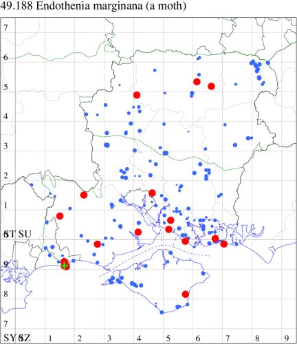 VC11: Marchwood, one, 31 Jul (CTha); Itchen Valley C.P., two, 19 Jul (F.M.G.); Stubbington, one, 29 Jun; one, 19 Jul (DPH); Lee-on-Solent, one, to pheromone lure, jAN Lure, 02 Jul (IHrg); Fareham, one, 20 Jul (ADT det. RJD); one, 30 Jul (IMcP); two, 25 Jun; one, 23 Jul (MLO det. RJD); Waterlooville, one, 30 Jul (DWhe); Christchurch: Cross Way, one, 26 Jun; one, 10 Jul (LPyk det. MJef); Tuckton, Bournemouth, one, 03 Jun (APard);