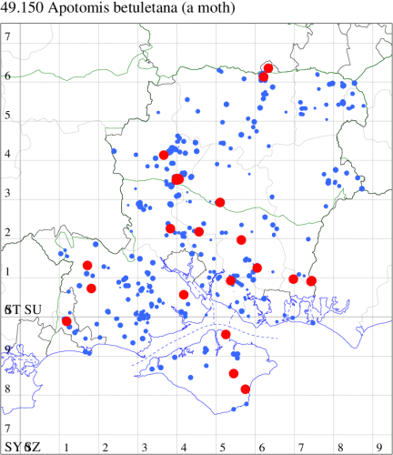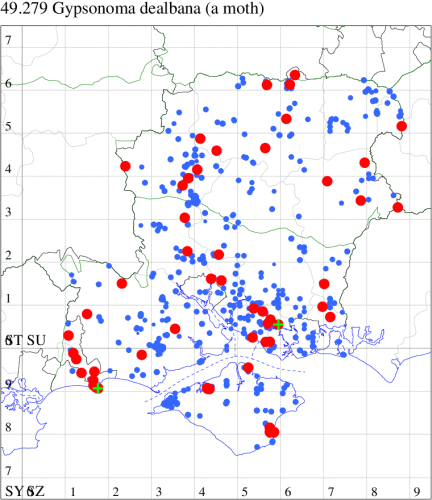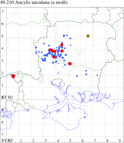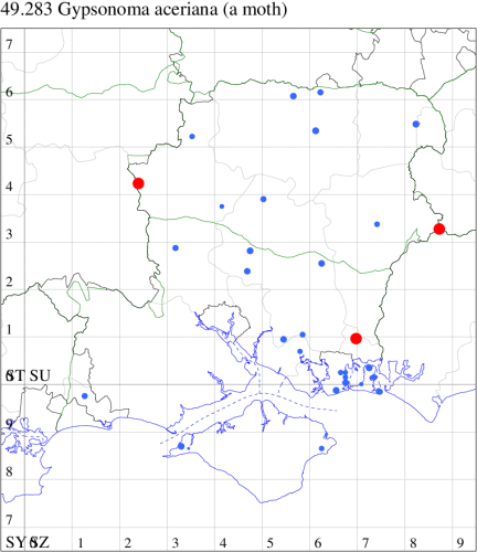 For the maps, all records prior to 2024 are shown by a blue dot (the larger the dot, the more recent), with the current year's records shown in red. As previous records are superimposed on any report for 2024, new sites have greater emphasis (i.e. will show as 'more red').