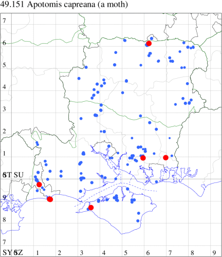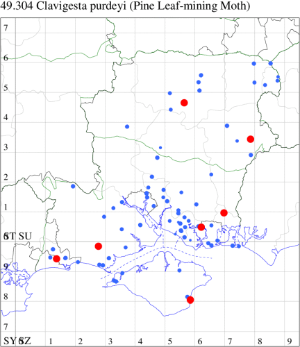 VC11: Millyford Bridge, one, netted, 31 Mar (AMD); Pig Bush, NF, one, 09 May; Romsey, one, 10 May (NRJ); Pigeon House Coppice, Boarhunt, one, det gen, 10 May (F.M.G. det. RJD); Flagpond Copse, Wickham, one, field obs., 20 Apr (DPH); The Moors NR, Bishop's Waltham, one, field obs., 25 Apr (DTru); Waterlooville, two, 30 Apr; one, to pheromone lure, to ARG lure, 04 May; one, 12 May (DWhe); Hengistbury Head NNR, one, 10 May (MJef); New Milton, one, field obs., 02 Apr (SKee);