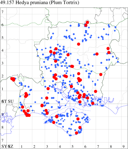 Common in woodland, hedgerows and gardens throughout much of the British Isles. In Hampshire and on the Isle of Wight widespread and common throughout. Wingspan 15-18 mm. Similar to H. nubiferana but generally smaller, H. pruniana may be distinguished by the two blackish postmedian dots being situated distad of the medial angulation of the median fascia; in H. nubiferana these are situated costad of the projection [Bradley]. Larva feeds on Blackthorn, Plum and Wild Cherry.