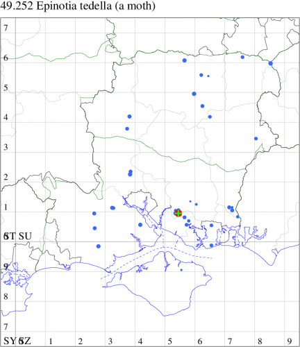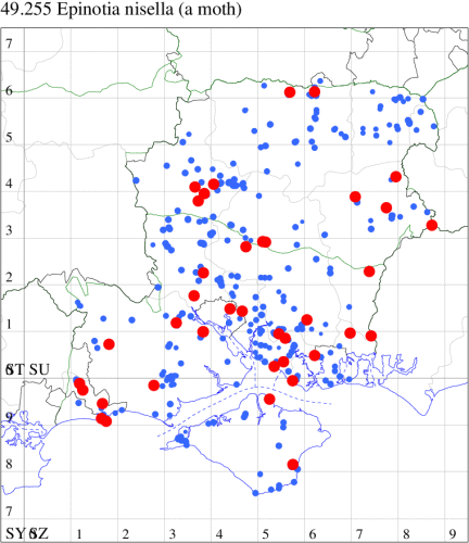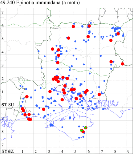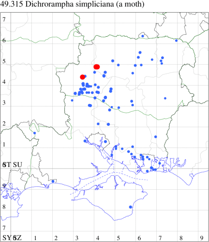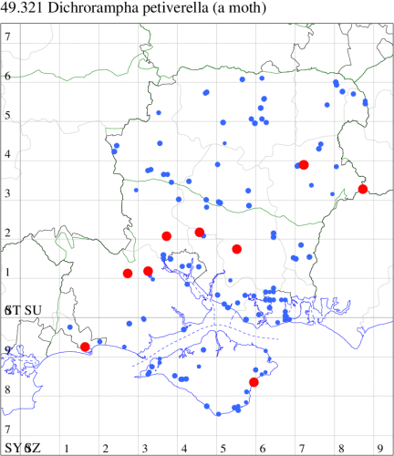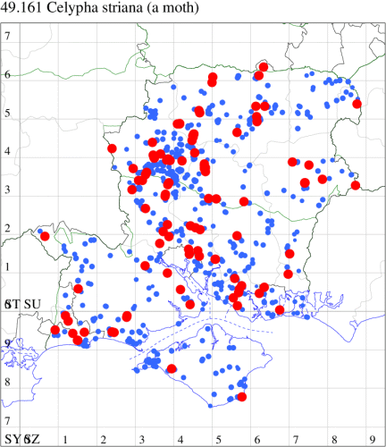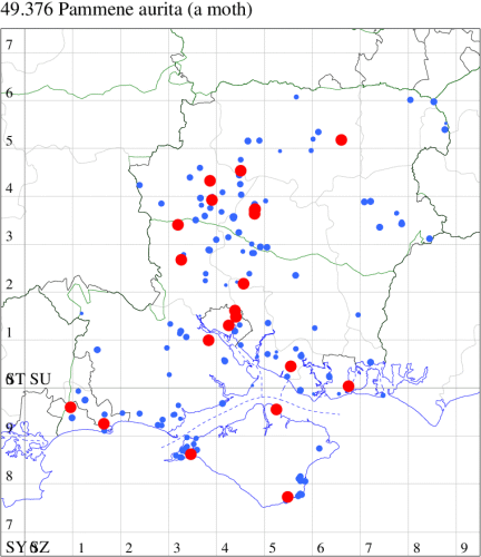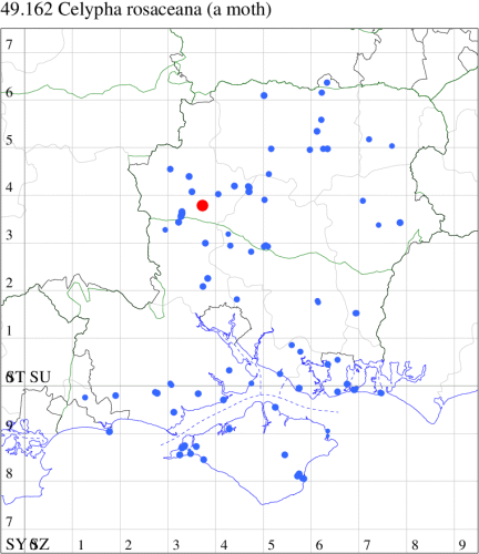 VC11: Howen Bottom, NF, one, 22 Jul (AMD); Pig Bush, NF, one, 24 Jul (NRJ); Woodlands, NF, one, 12 Aug (RBW); Romsey, three, 20 Jul; one, 23 Jul (NRJ); Bevois Valley, Southampton, present, 29 Jul; present, 30 Jul (MCrei); Swaythling, Southampton, one, 30 Jul (MEdg); Southampton, one, 19 Jul; one, 31 Jul (MGP); Itchen Valley CP, one, 19 Jul (CTha); Allbrook, one, 17 Aug (SIng); Botley Wood, one, 05 Aug (AMD); Funtley, one, 01 Aug (TDC); Fareham, one, 24 Jul (IMcP); one, det gen, 01 Sep (MLO det. RJD); Pigeon House Coppice, Boarhunt, one, male det gen, 12 Jul (F.M.G. det. RJD); Portchester, one, 31 Jul; one, 12 Aug (CEH, JGS); Waterlooville, five, 15 Jul; two, 26 Jul; four, 01 Aug; three, 04 Aug; one, 07 Aug; one, 13 Aug; two, 15 Aug; one, 19 Aug; two, 26 Aug (DWhe); Hurn, one, 01 Aug (MJef); Hengistbury Head NNR, one, 01 Aug (HengistH det. RPH); Hengistbury Head, one, 30 Jul; four, 18 Jul; one, 27 Aug (MJef); Sway, one, 31 Jul; one, 28 Aug (SKee);