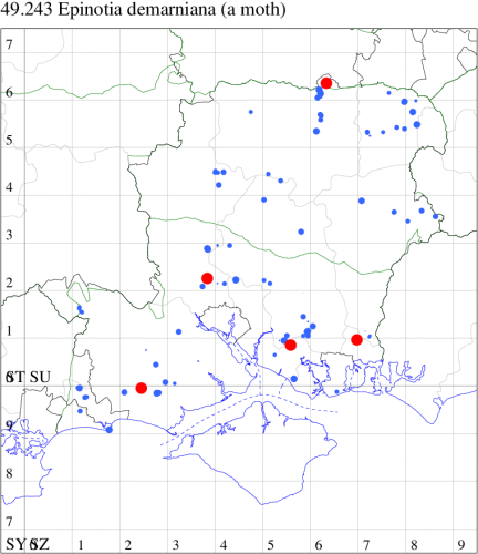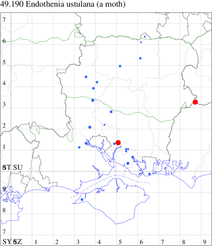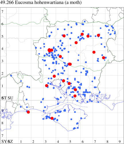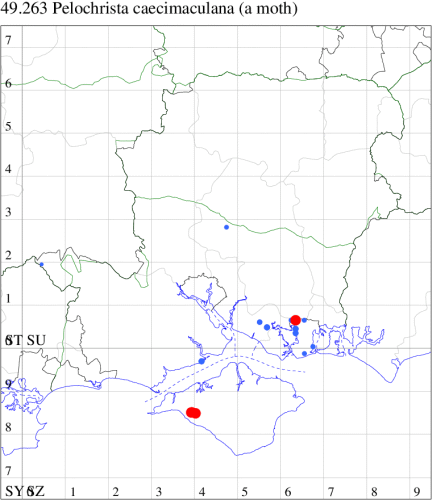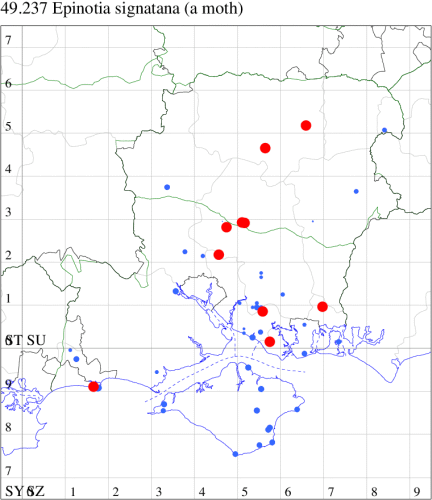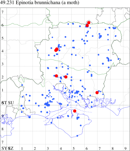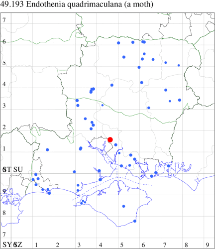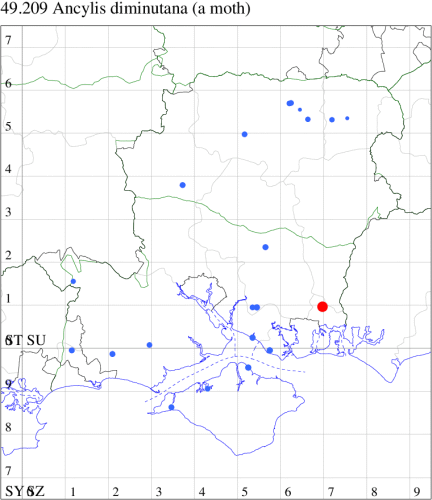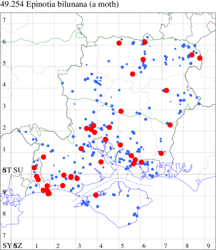 Nationally scarce (Na) in woodland in parts of southern England. In Hampshire very local and primarily associated with semi-ancient woodland, principally Botley Wood and a few sites in the New Forest, and in the north from Pamber Forest. Not recorded from the Isle of Wight to date. Wingspan 17-21 mm. Distinguished from E. profundana by the obsolescent basal fasciae, which are never strongly developed on the dorsum, and the deeply indented whitish dorsal blotch [Bradley]. Larva feeds on Apple, living within a spun or rolled leaf.