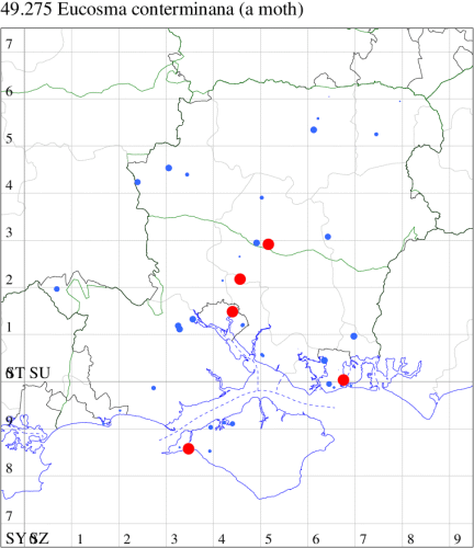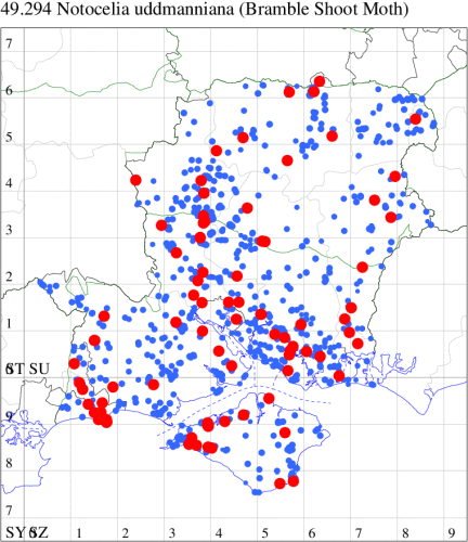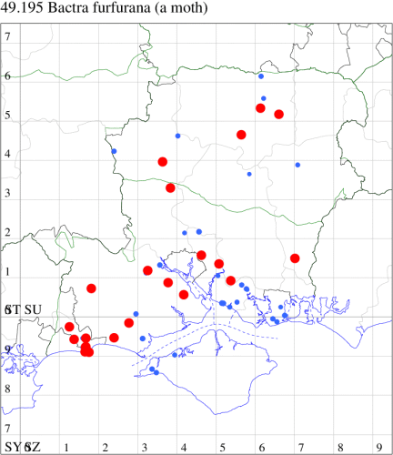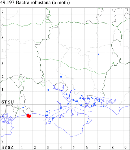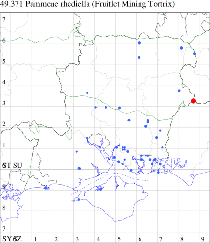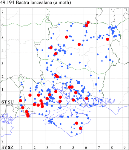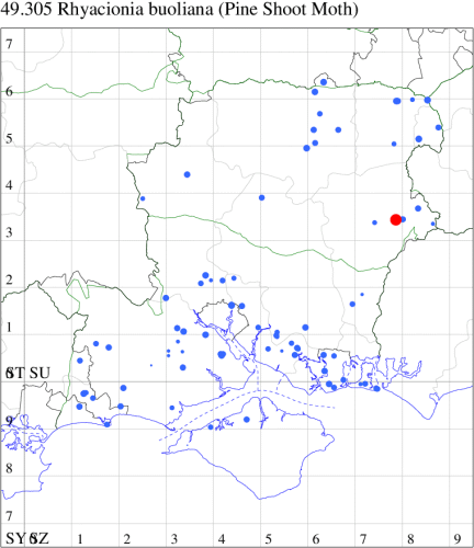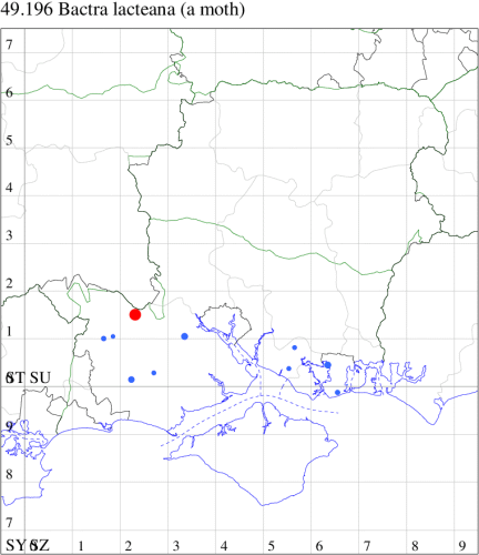 VC11: Woodlands, NF, one, 03 Jun (RBW); Waterlooville, four, to pheromone lure, to ARG lure at 6pm, 23 May; one, 25 May; one, aRG lure, 29 May; two, to pheromone lure, to SKI lure. Gen det, 06 Jun; one, 07 Jun (DWhe); Stanpit Marsh LNR, one, 22 Jun (PAB); Sway, one, conf MJW, 31 May (SKee det. MJW)
