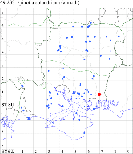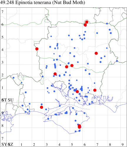 Local in beech woodland across much of southern England. Fairly widely, but sparsely distributed across much of Hampshire and on the Isle of Wight. Wingspan 10-12 mm. The relatively slender and attenuate forewing and the obscure and poorly defined fasciate markings and costal strigulae distinguish this species from S. nitidana [Bradley]; confusion with Pammene germmana is also possible. Larva feeds on Beech, living between leaves spun together with silk, and over-wintering as a pupa.