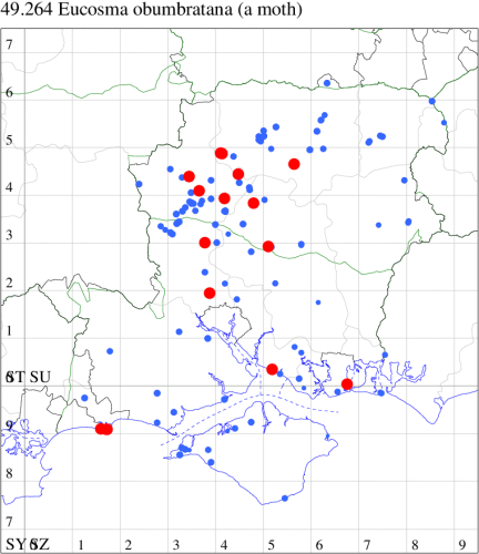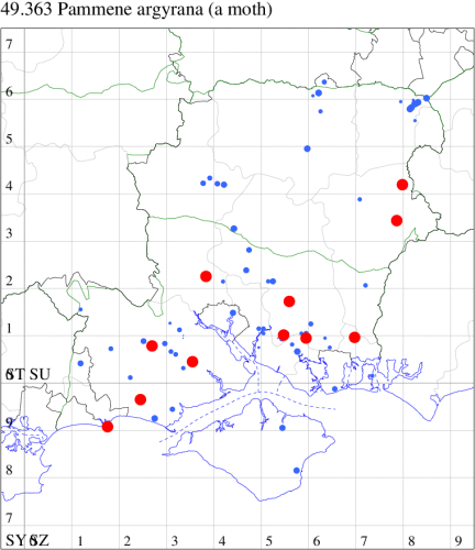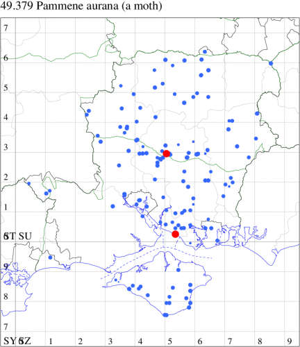 VC11: Earliest: Portchester, 23 May, 1 (DH-J) Latest: Pigeon House Coppice, Boarhunt, 12 Jul, 1 (F.M.G.) Max count: Romsey, 09 Jun, 4 (NRJ)
