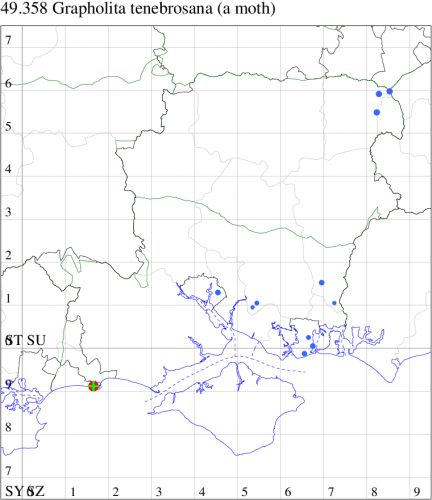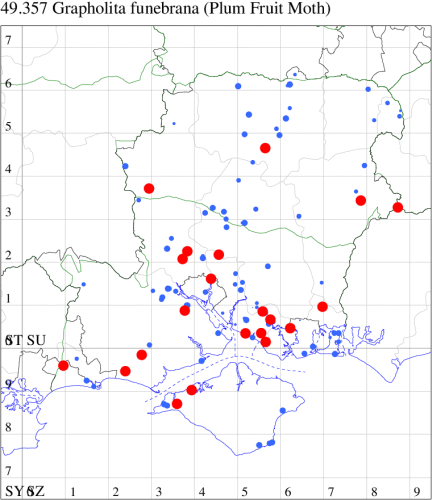 Local in gardens, orchards and hedgerows throughout much of southern England, southern Wales and southern Ireland. In Hampshire and on the Isle of Wight fairly widespread and not uncommon in gardens where there are plum trees, but apparently largely absent from the New Forest, and on the Island confined to the extreme west. Wingspan 10-15 mm. Similar to G. molesta but generally larger; distinguished from G. tenebrosana by the darker, greyish fuscous labial palpi and frons and the whitish irroration in the distal and medio-dorsal areas of the forewing [Bradley]. Larva feeds within fruit of Plum, Blackthorn, Wild Cherry and similar, over-wintering in a cocoon.