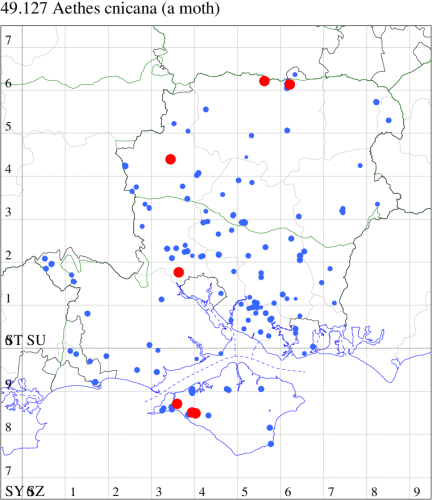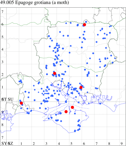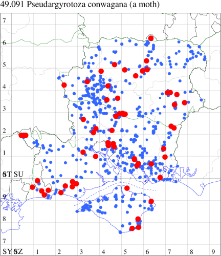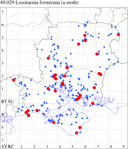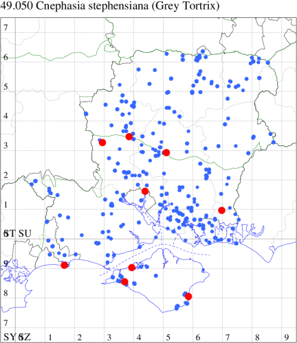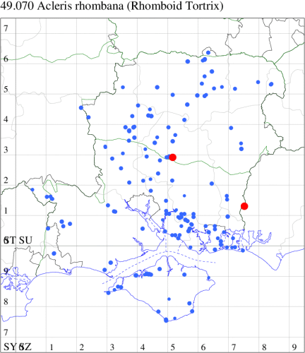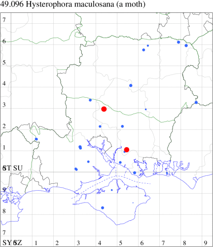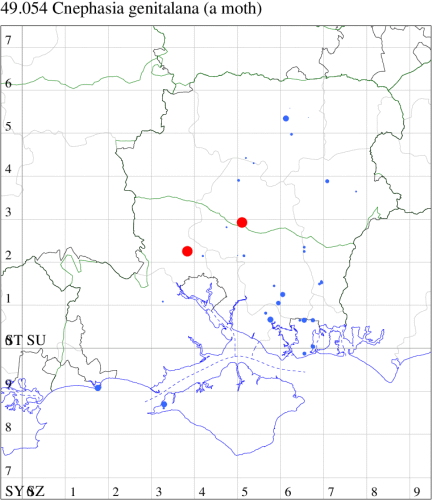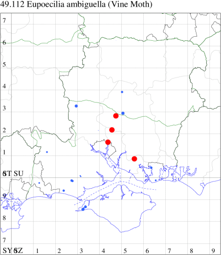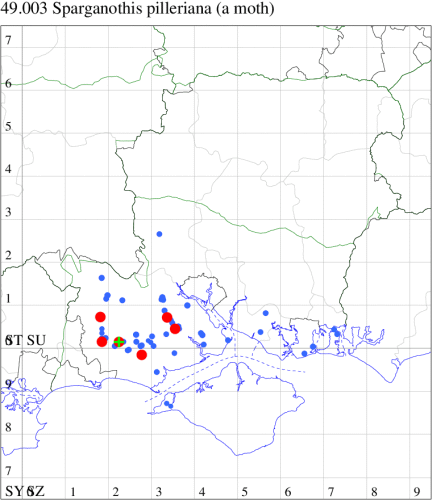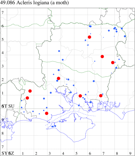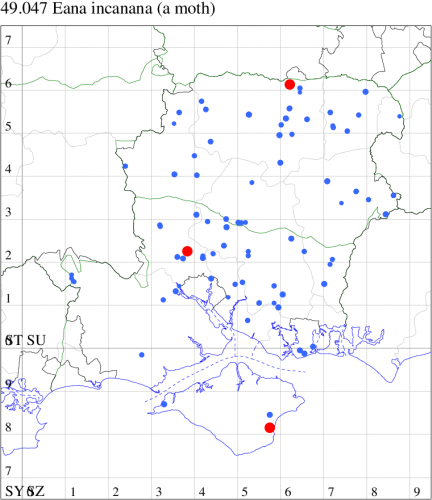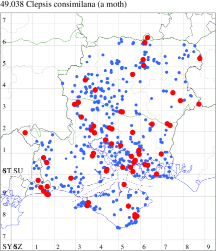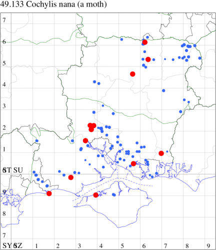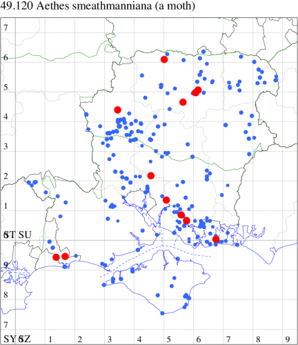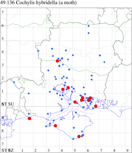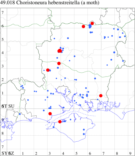 VC11: Romsey, one, 26 Jul (MJB); one, 30 Jul (NRJ); Hurn, one, 01 Aug; Hengistbury Head NNR, one, 05 Aug (MJef); one, 11 Aug (MoTay det. MJef); Burton, nr Christchurch, one, 12 Jul (JStw);