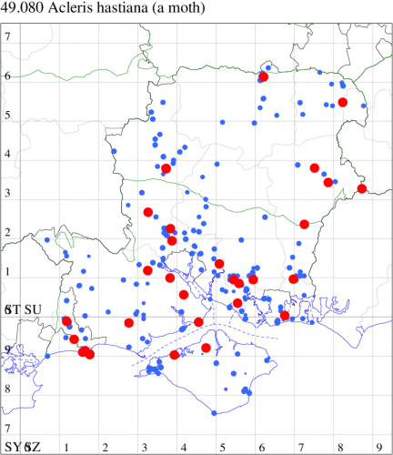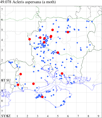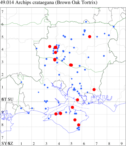 Common in woodland and gardens throughout the British Isles. In Hampshire and on the Isle of Wight widespread and fairly common in woodland throughout. Wingspan male 15-21 mm, female 16-24 mm. Most similar to A. crataegana, but differing in the more variegated appearance and smaller size [Bradley]. Larva feeds on various deciduous trees and bushes, including Oak, Elm, Lime, Hazel, Field Maple, Sycamore and Ash, living within a spun or rolled leaf, and over-wintering as an egg.
