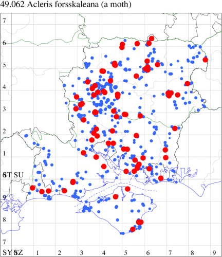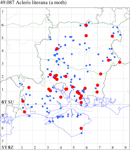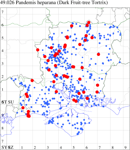 Common in woodland throughout much of England and Wales. In Hampshire widespread but rarely common, although frequent in Botley Wood. Probably under-recorded elsewhere, none more so than on the Isle of Wight, where it was not recorded until 2013. Wingspan 18-24 mm. Weakly marked specimens, especially those with drab coloration, may be confused with forms of Dark Fruit-tree Tortrix P. heparana, from which the male may be distinguished by the white head and the female by the presence of reddish ochreous suffusion in the apical area of the hindwing [Bradley]. Larva feeds on various deciduous trees and shrubs, living within a spun or rolled leaf.