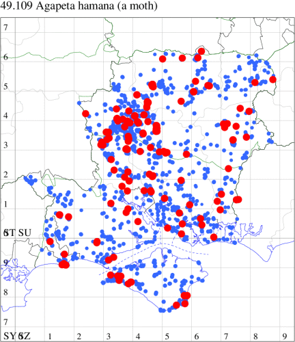 VC11: Marchwood, one, 11 Aug; one, 28 Aug (CTha); Romsey, one, 23 Jun (NRJ); Dibden Purlieu, one, 11 Aug (RAC); West End, two, 01 Sep (AMD); Brownwich Cliffs, Titchfield, one, 16 Aug (F.M.G.); Stubbington, one, 11 Aug (DPH); Funtley, one, 22 Jun; two, 25 Jun (TDC); Lee-on-Solent, two, 23 Jun; two, 25 Jun; one, 26 Jun; two, 30 Jun; two, 01 Jul; one, 02 Jul; one, 01 Sep; one, 07 Sep (IHrg); Fareham, one, 16 Aug (ADT); one, 12 Aug; one, 14 Aug; one, 17 Aug; one, 02 Sep (MLO); Botley, one, 11 Aug; one, 08 Aug; one, 09 Aug (SLB); Portchester, one, 27 Aug (CEH, JGS); one, 09 Aug; two, 11 Aug; one, 18 Aug (DH-J); Horsea Island, one, 07 Jun (F.M.G.); Portsmouth, one, 31 May; one, 03 Jun; two, 17 Jun; one, 25 Jun; one, 11 Jul; one, 16 Jul; 14, 09 Aug; eight, 10 Aug; six, 11 Aug; one, 26 Aug; three, 31 Aug; two, 01 Sep (IRT); Waterlooville, two, 02 Jun; one, 04 Jun; one, 21 Jun; two, 23 Jun; one, 07 Aug; one, 09 Aug; two, 11 Aug; three, 13 Aug; six, 15 Aug; three, 17 Aug; four, 19 Aug; seven, 22 Aug; three, 24 Aug; five, 26 Aug; two, 27 Aug; one, 29 Aug (DWhe); West Walk, one, 23 Aug (F.M.G.); Southleigh Forest, one, 22 Aug (CGree det. TJon); Hurn, one, 02 Sep (MJef); Christchurch: Cross Way, one, 26 Aug (LPyk); Sway, one, 12 Aug; one, 13 Aug (SKee); Sway, NF, present, 01 Sep (DMui); Pennington, one, 01 Sep (RFC);